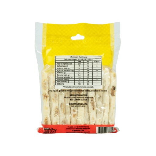 - Ingredientes: Açucar, glicose de milho, amendoim torrado sem sal, ovo (clara de ovo) e sal